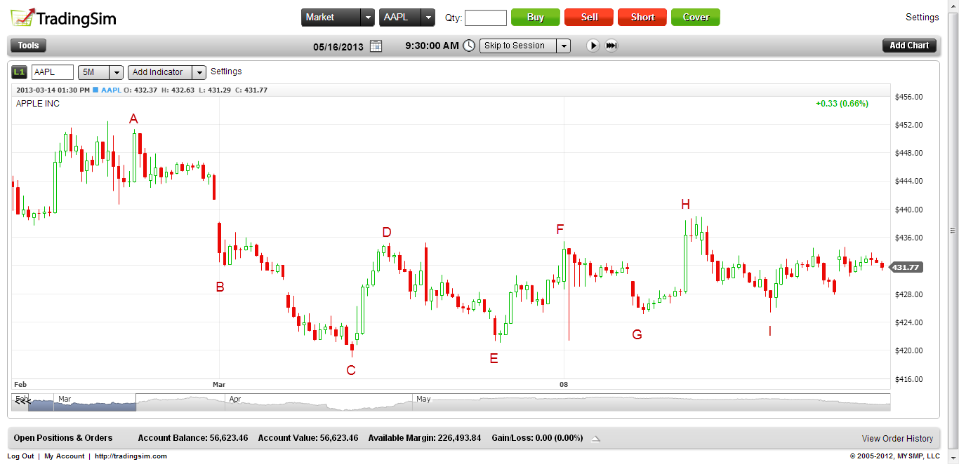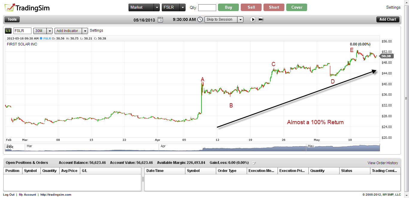 I like real-life examples, so here goes one. Below is a chart of FSLR over a 5-day trading period. The stock almost increased by a full 100%. As you can see in the chart, if you were day trading, you would have tried to time the swing points at A, B, C, D and E. In these rare cases the profit potential for swing trading is as sweet as they come.