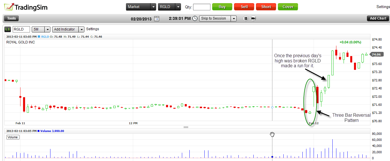 In our next example we will review a 3 bar reversal pattern for Royal Gold (RGLD) that developed over 2/20/2013 and 2/21/2013. You will see from the image RGLD had a gap down in the morning, traded flat for most of the day and then closed near the low. Then the stock had a gap up in the morning to close above the highs for both the first and second candlestick. This then triggered a rally of over 2% by 10am once RGLD exceeded the high set on 2/20/2013.