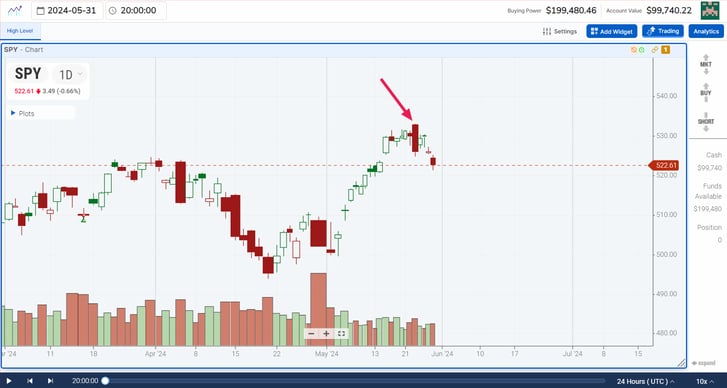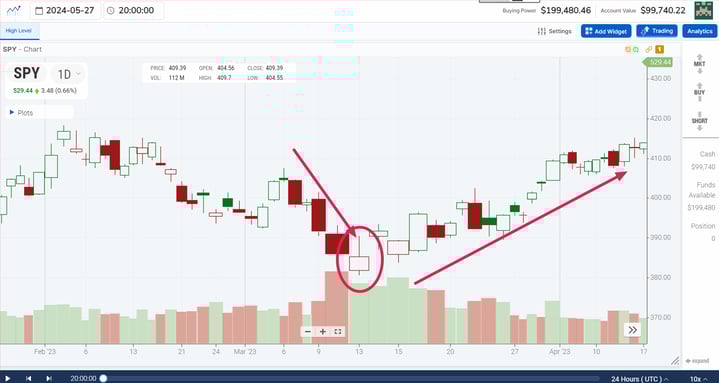 The first thing you should notice is the downtrend in the SPY from early February. However, this downtrend increased its intensity on the 7-10th of March. Notice those large, bold red volume candlesticks as the SPY declined down to the 380 level. This marked a climactic volume signature that culminated in an inverted hammer candle on the 13th of that month, denoted by the circle.