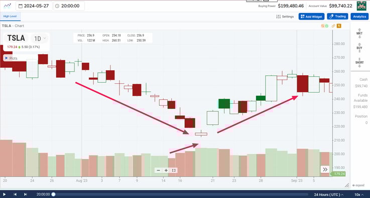 Notice in the example provided above that TSLA advanced above the $750 level on higher-than-average volume on the 21st of July. This was a solid breakout candle. It is easy to see how "fat" the candle is because of the excessive trading volume that day.