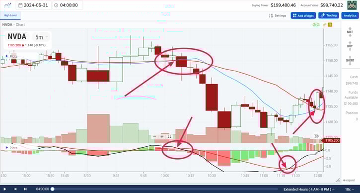 In this example of NVDA, we have a 5m chart around 10 am New York Time. You'll see the circles denoting a cross in the moving averages on the chart as well as on the MACD simultaneously. The chart is using a 10 and 20 sma while the MACD is set to 6 and 20. Notice the decisive break lower shortly after the MACD cross.