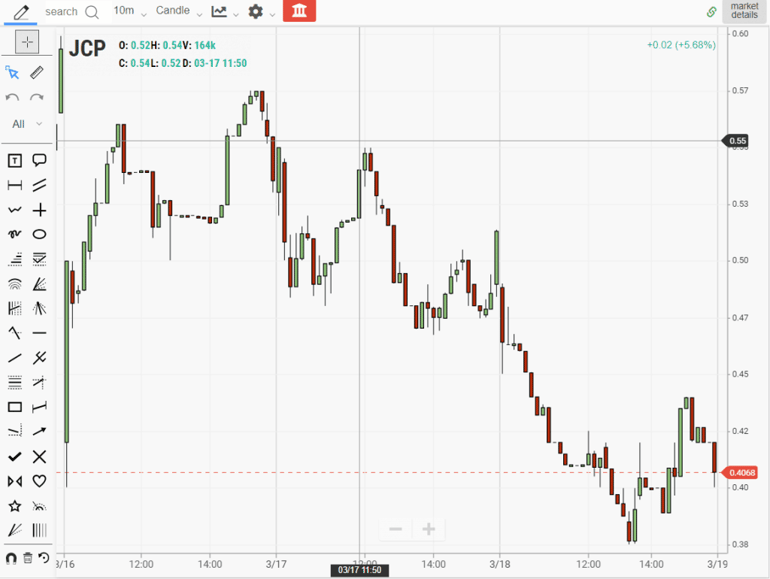 This Trading Sim chart shows how far J.C. Penney stock has fallen since its last earnings report.