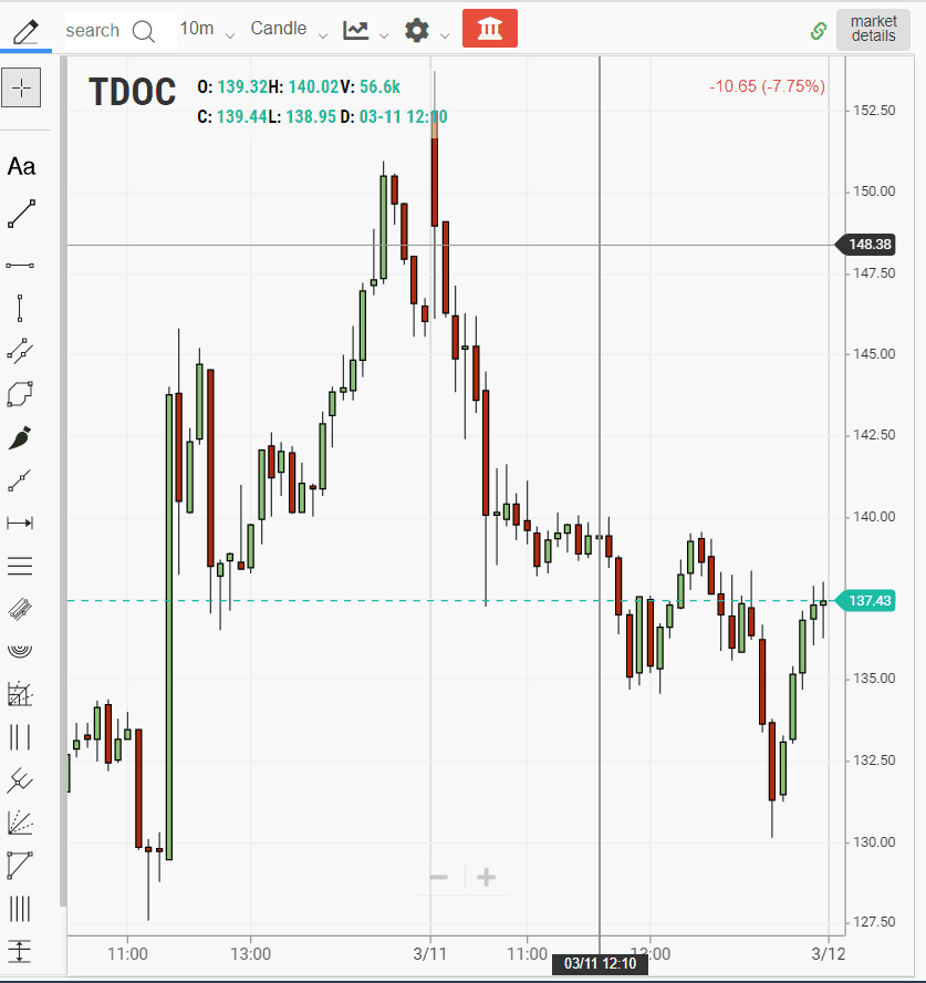 “Our clinical teams, thousands of physicians around the world, are actively working along with our commercial teams and clients to ensure that members have the most timely and relevant access to the latest information during this unfolding situation, and access to care if and when they need it,” said Gorevic. This Trading Sim chart shows mostly steady growth for Teledoc stock.