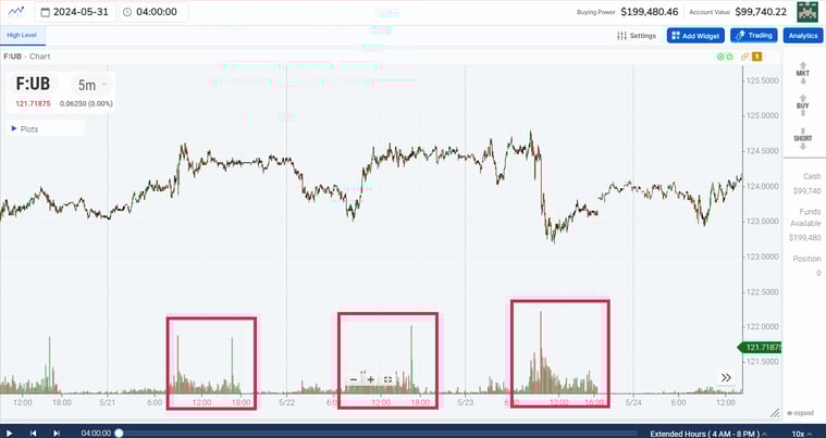 Here is a good look at the volume on a Crude Oil futures chart inside TradingSim. Compared to the indices, you can see more liquidity in the early morning and afternoon hours, though regular stock market hours remain the most traded:
