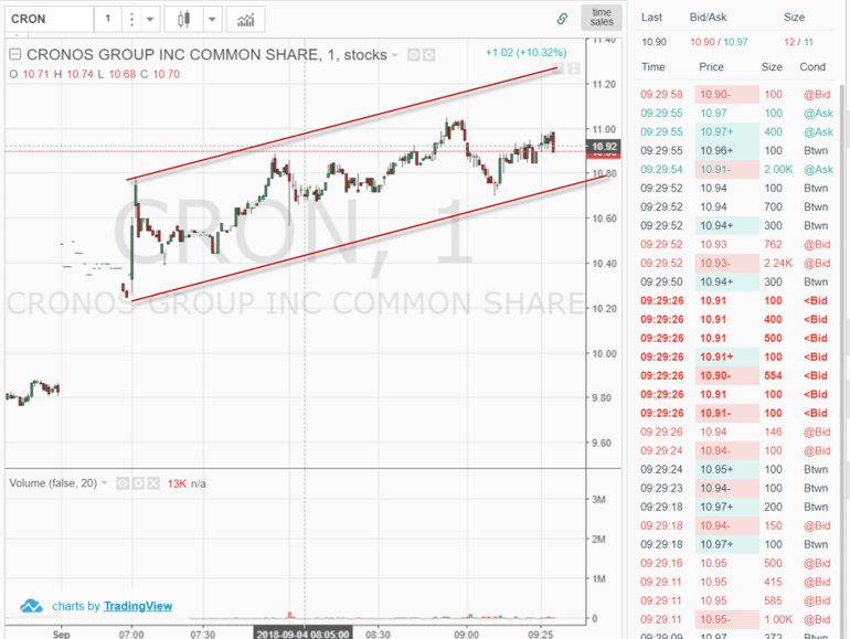 CRON had great volume and price structure. However, the stock was running in an up channel and any breakout would just run the stock up to resistance from the morning.