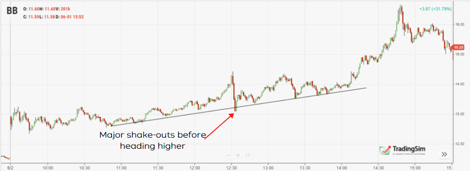 The reason for this is that many traders will enter these positions late, which leaves them all holding the bag upon reversal. Once they are shaken out, the counter pressure will be weak comparatively, and the stock typically goes up again. This usually leads to a push back to the high.