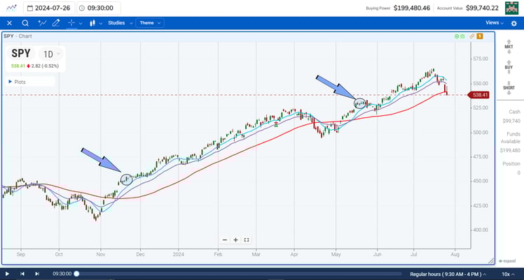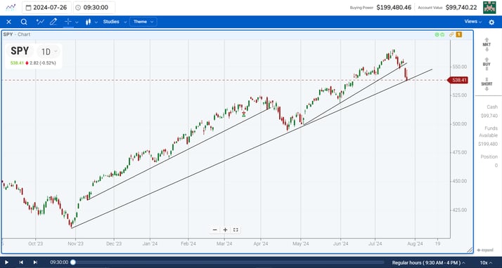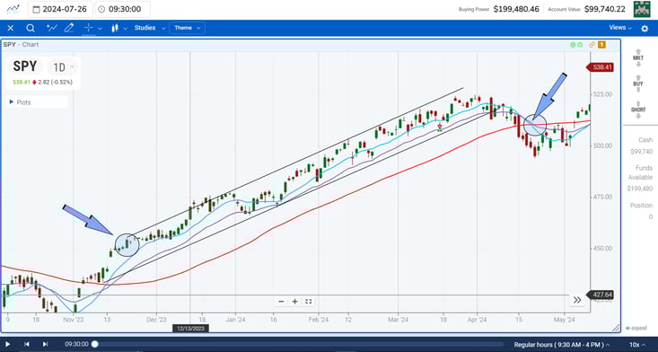 Trend traders will wait for a breakout from a consolidation and ride a wave of momentum. However, not all trends are created equally. Some trends are shorter-term; some are longer-term. The slope of a shorter-term trend may be steeper than the longer-term trend. Here is an example of a few different trends in the SPY from 2024: