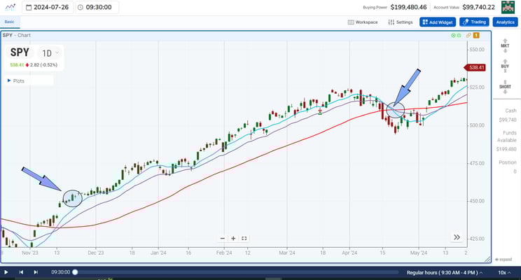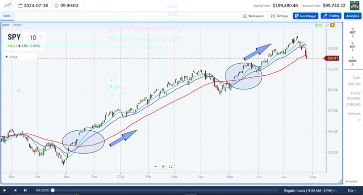 Market uptrends generally follow certain indicators. For example, moving averages will often smooth out the chop of markets and let you know when the market is trending upward. As we show you in the examples below, these indicators, like the 10 moving average, 20 moving average, and 50 moving average, are all near-to-long-term indicators. If the market is moving upward, they are stacked on top of each other and trending at an upward angle.