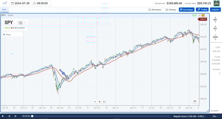 However, there isn't much need for an indicator for a power trend if you have moving averages enabled on your trading charts. All you need to know is when the market is beginning to trend upward again. Perhaps you've seen the market create a recent bottom. From that point, you apply the four rules that Webster has outlined and that we mentioned above, then follow the trend.