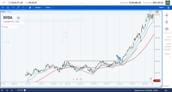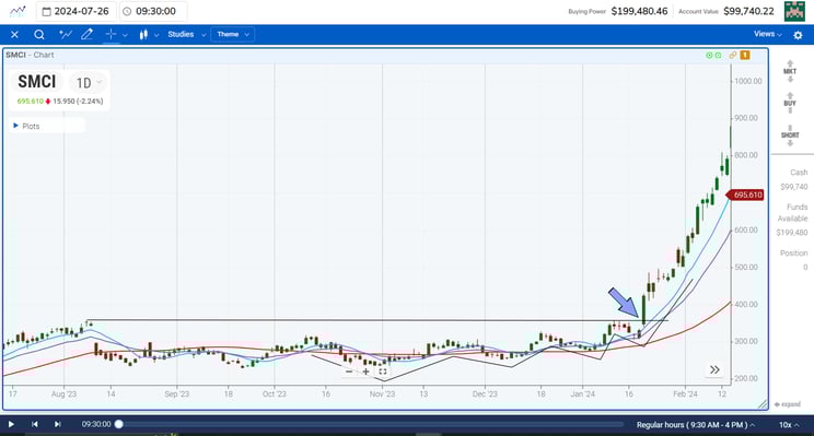 For example, during the powerful trend from November 1st 2023 until summer of 2024, many of the tech stocks like NVDA and SMCI led strong surges in the market. Let's take a look at the patterns these stocks had before breakout out.