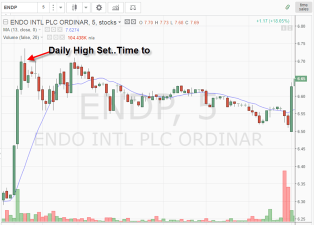The last chart I am displaying where the stock makes a new daily high may occur 20% of the time. But even when these new highs occur, they often only last a few minutes before the stock rolls over.