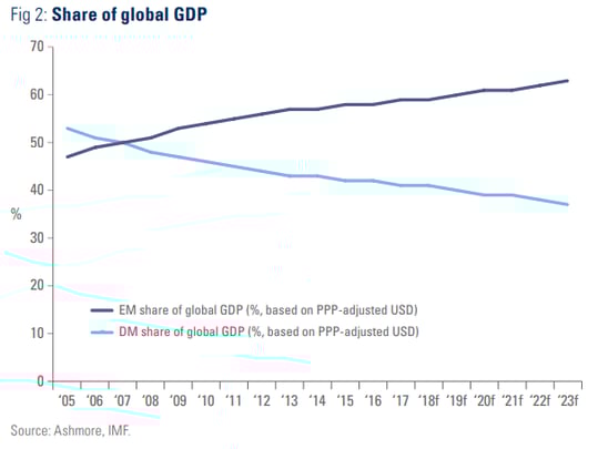 According to Ashmore Group, emerging countries constitute around 60% of the world’s GDP and around 80% of the global GDP growth rate, yet their share of the global market capitalization is barely 10%. Around 85% of the world’s population lives in countries categorized as emerging economies.