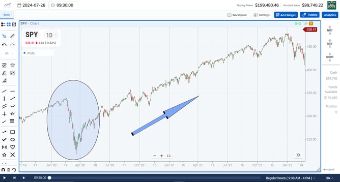 It is no surprise that news events affect the stock market. Any seasoned trader knows the impact war, famine, or corporate news can have on individual stocks or the market as a whole. Anyone who lived through the COVID-19 pandemic that began in 2020 likely remembers the "COVID Crash" that occurred in the market that year, followed by one of the longest and most aggressive bull markets the market has ever seen. We've got a chart to show you below. If events like this can affect the market, so can politics.