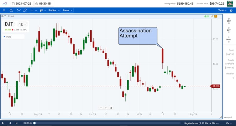 Surprising events in politics can also introduce uncertainty to the economic outlook, affecting investor behavior. One recent example was the assassination attempt of President Trump. This led to a shocking increase in his media company, the ticker symbol DJT. It also marked a top in the indices. We'll discuss more about this in the Trump Trade below.