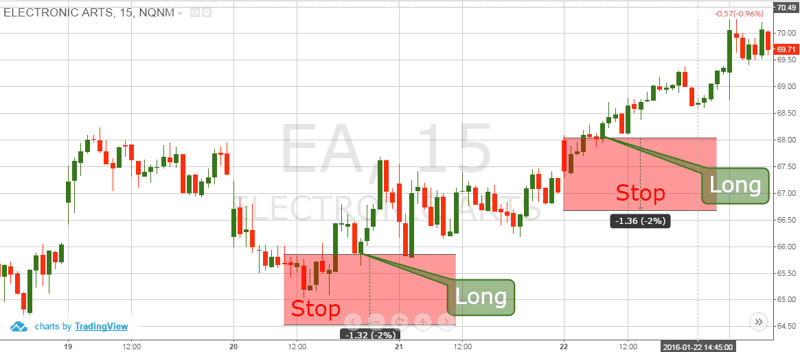 This is the 15-minute char of Electronic Arts for Jan 15 – 25, 2016. The image shows two long entries with their respective stop loss orders.