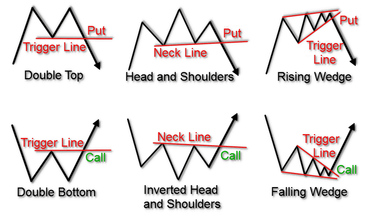 We have a trigger line of each pattern. This is the line which gets broken by the price when the pattern is confirmed. In this manner, when the price breaks the trigger, this is a signal to enter the market. So, the upper three patterns should be traded with a call option. Opposite of that, the lower three patterns should be traded with a put option.