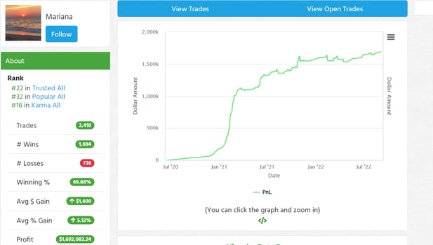 Mariana got her start with Timothy Sykes. As a Colombian-American woman, she is an inspiration to many women to get involved in trading, claiming it doesn't take much superficial knowledge of math or other advanced financial education. Mariana proved this by becoming Sykes's youngest female protege to reach the million-dollar milestone. In a two year span from July 2020 to July 2022, Hincapie amassed over $1.5 million in profits according to Profit.ly. ¡Qué chévere!