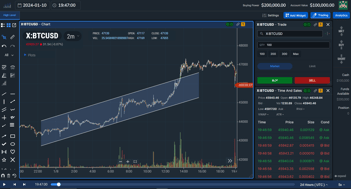 For example, let's say you want to explore Bitcoin price action on the day that the SEC approved the Bitcoin ETF. This occurred on January 10th, 2024. In a proper crypto trading simulator like TradingSim, you would be able to locate this day and choose to replay the real-time price action for that day. Here is what it might look like: