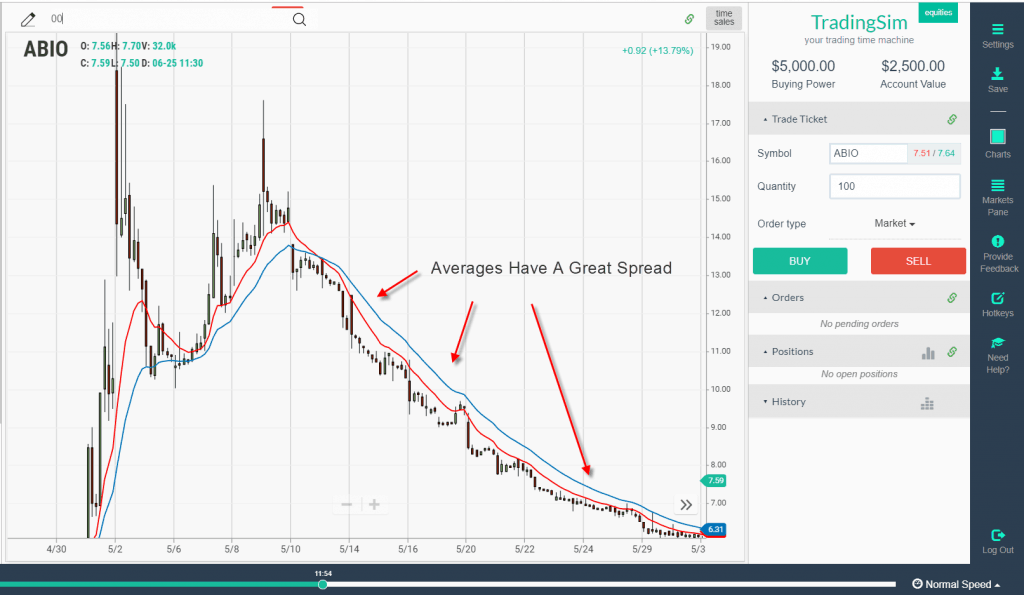 The above chart is a clear example of when a stock is trending really hard. Notice how the averages do not cross at all. To add more validity to the trend, the averages are also far apart all the way down.